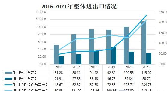 從全體上看,近兩年我國石英(天然砂在外)和石英巖(不管是否粗加修整或僅用鋸或其他辦法切割成矩形板或塊)出口量堅持增加趨勢,進口量出現下滑,進出口量存在較大差距,但進口金額一度領先。2021年,我國共出口石英及石英巖115.09萬噸,出口金額為234.75百萬美元,共進口石英及石英巖30.7萬噸,進口金額為212.46百萬美元。